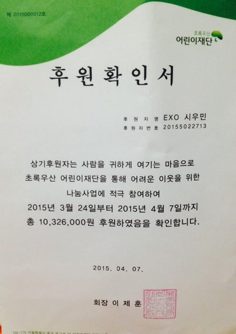 @xiuday_event 후원서는 액자에 넣어, 전시회 팜플릿(참여명단)과 함께 민석이에게 전달하도록 하겠습니다. 후원기금은 주로 결식아동, 가정폭력 및 학원폭력에 노출되는 아이들을 위해 사용될 예정입니다. 전시회에 와주신 모든 분들께 감사드립니다.