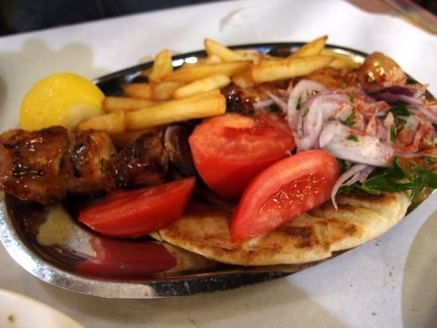 수블라키는 그리스어로 꼬치구이를 말해요. 빵에 고기와 감자튀김, 야채까지 넣어서 싸 먹으면 기로스가 된답니다.