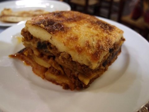 가지와 호박, 양념된 다진고기 위에 베사멜 소스를 얹어 오븐에 구운 무사카예요. 부드러워서 입 안에서 살살 녹아요.
