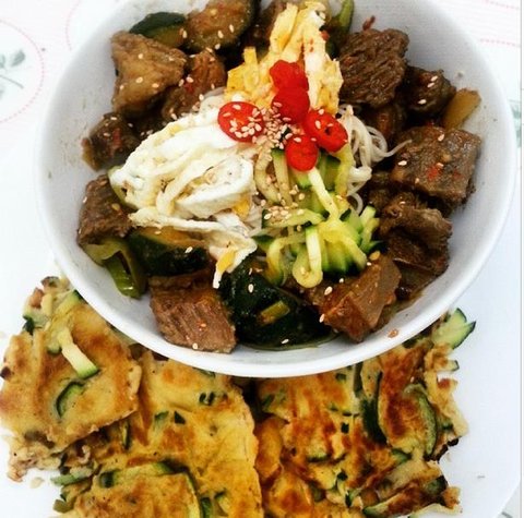 갈비찜하고 남은 고기로 만든 갈비국수랑 애호박전!