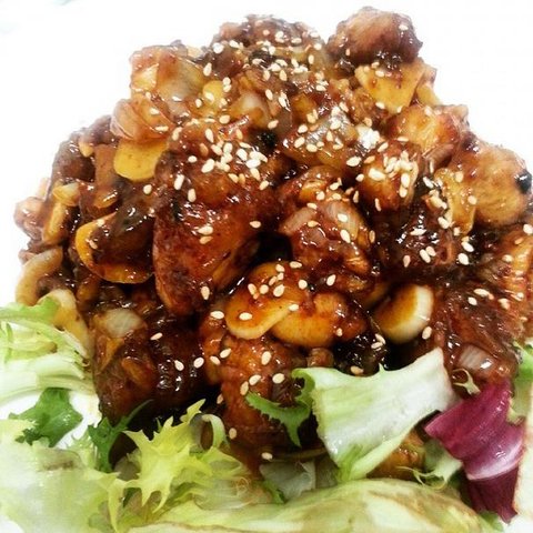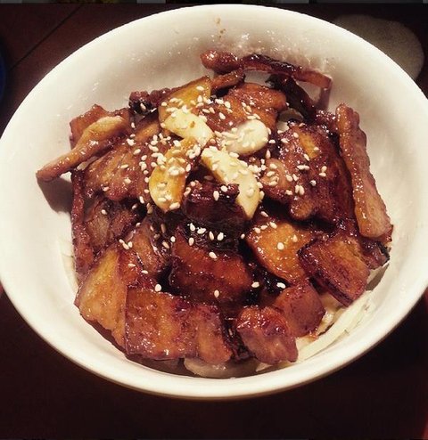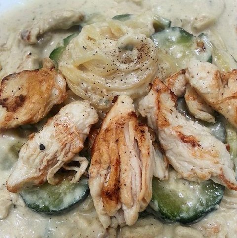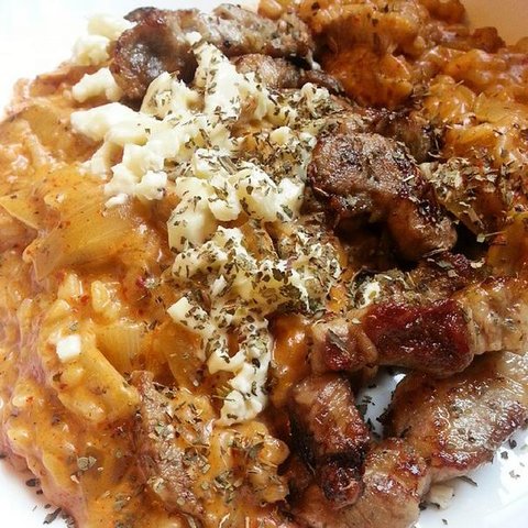 크림소스에 고추가루랑 고추장넣어서 매콤하게 간을 한 뒤 구운목살을 얹였어요.