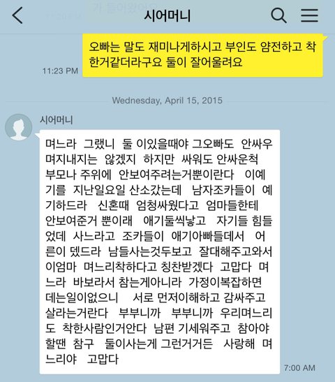 신랑이 부부관계에서 가장 중요한 믿음을 깨뜨려버릴만큼 큰 실수를 저지르고나서 어떻게 저한테 저런 문자를 보내실수있는지 너무 서운하고 화가납니다. 어머니께서 하신 말씀이 다 맞는 말씀이시지만 지금 이 상황 이 시점에 저런 내용의 문자를보내신게 도저히 이해가 가지않습니다. 남편의 행동으로 인해 깨져버린 믿음을 회복하려면 남편은 다시 신뢰를 쌓으려 노력을해야하고 부인은 믿어주려고 노력해야한다가 맞지않나요? 자신의 아들이 상식밖에 일을 저질렀고 믿음을 깨 버리는 행동을 했는데 남이 남편을 욕해도 아니라고 말할줄알아야하고 남편을 믿어야 착한부인이다??!? 저는 어머니께서 자신의 아들이 저에게 얼마나 큰 상쳐를줬고 얼마나 큰 잘못을 저질렀는지 생각않하신다고 밖에 생각이 안드네요.