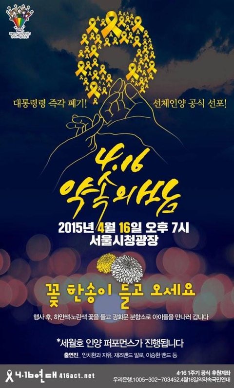 안산, 광주, 서울역 등 국내 곳곳에서 세월호 사건을 애도하는 행렬이 이어지는 가운데 지난 4월 16일 세월호 사건 1주기를 맞이하여 광화문 광장에서 대형 추모 행사가 열렸다. 광화문 광장에 5천 여명, 시청 광장에 6만5천 여 명이 모였던 것으로 보인다. 이번 추모행사에선 시민들이 모여 안타깝게 생명을 잃은 피해자들과 유가족들을 위로하고 애도하는 한편, 세월호 인양과 진실규명을 호소하는 시간을 가졌다.