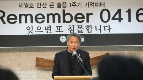 "6.25 전쟁과 IMF 실직자들이 무더기로 거리로 지하도로 내몰린 시대와 함께 국민적 공감을 일으킨 세월 호 참사 1주기 되는 이 날에 이 큰 상처가 흉터로만 남지 않고 교훈과 흔적이 되며 치유하고 회복할 수 있는 신앙의 몸부림이 있기를 간절히 소원합니다. 1년 전 전국민적인 공감과 아픔이 국민적인 갈등과 대립으로 치달은 오늘 우리들은 정치인들에게는 더 이상 아무것도 기대할 수 가 없게 되고 말았습니다. 깨어있는 시민들과 행동하는 양심들이 화해와 일치를 위하여 해야할 일은 너무도 분명합니다. 다양한 사건들이 계속 회전되고 무의미와 소멸의 위기 속으로 사라져 버리지만 성서의 사건과 역사적 사건은 소멸해 가는 속도를 넘어서서 기억해야 할 것은 반드시 기억해야 합니다. 그래야만 그 자리에 존재하게 하는 성령의 힘과 능력이 작용합니다. 잊혀지지 않는 말씀은 계시가 됩니다. 잊으면 또 침몰합니다!” 고 말했다.