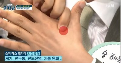 좋은 혈 자리로 엄지와 검지 사이 움푹 파인 곳으로