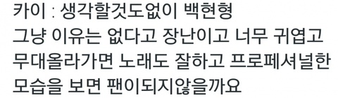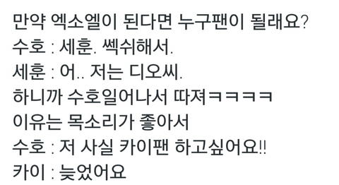 종인이를 뽑은건 경수: 저라면 카이 왜냐면 퍼포먼스를볼때 제가 여자라면 빠져들것 같아요