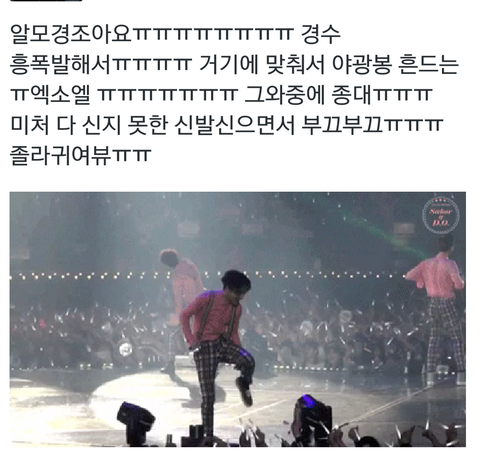 경수 팔 휘적휘적거리는거랑 팬들이 같이 봉흔드는게 ㅈ나 귀여워서 저장을 해야겠는데 이거 이짤 밖에 없는데 ㅅ뷰ㅠㅠㅠㅠ 있는사람?? 짤투척 좀..