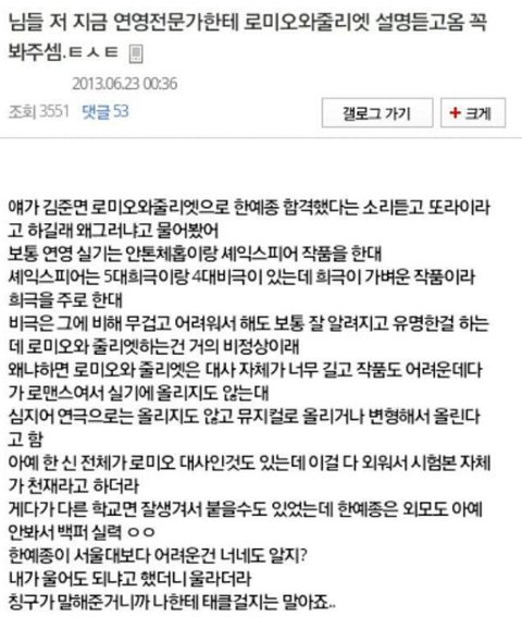 실기때 연기를 했고 그게 얼마나 대단하고 어려운건지 말해주고 싶음 그리고 한예종은