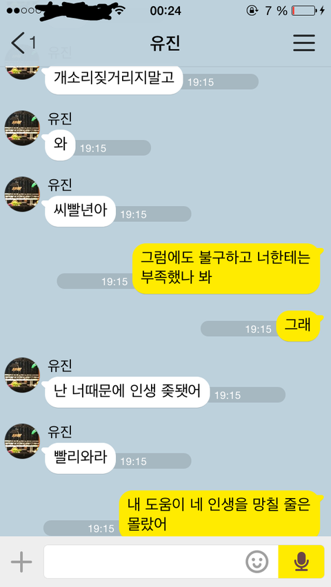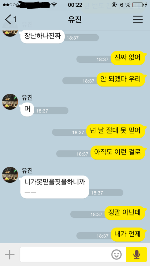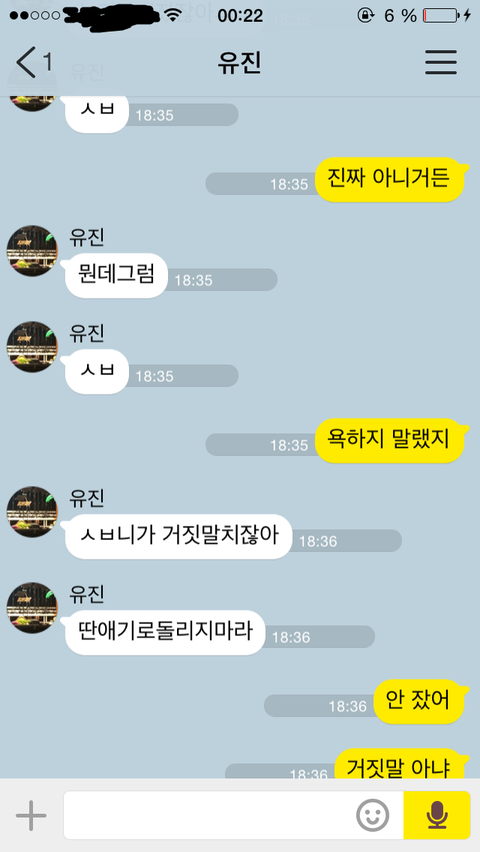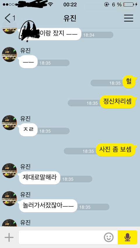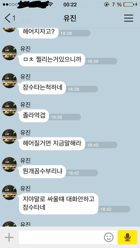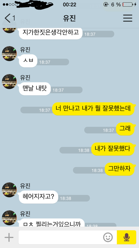 전남친과 카톡으로 다투던 중 전남친이 “끈다 폰” 하길래 저도 그 길로 전남친 카톡을 차단했습니다. 그리고 우리가 헤어졌던 때에 전남친을 지켜줬던 사람에게 말했습니다. 우리가 다시 사귄다는 것을요. 전남친은 제가 친구들에게 우리의 재회를 알리기를 원하면서도, 본인은 지인들에게 알리지 않았습니다. 화가 났던 제가 먼저 카톡으로 알렸죠. 그 지인이 전남친과 주고 받은 카톡을 캡쳐해서 저에게 사진으로 보내줬습니다. 전남친이 이렇게 대답했더군요. “그냥 개싸이코임 무시하셈.” 뒤에서 제 얘기를 그런 식으로 하고 있는 줄은 몰랐습니다. 그 지인이 전남친과 저를 동시에 카톡에 초대했습니다. 전남친이 그 카톡창에서 말하더군요. “다시 만나자고 한 적은 없으.” 입만 열면 거짓말을 하는 전남친에게 지쳤습니다.