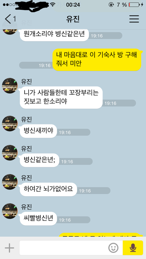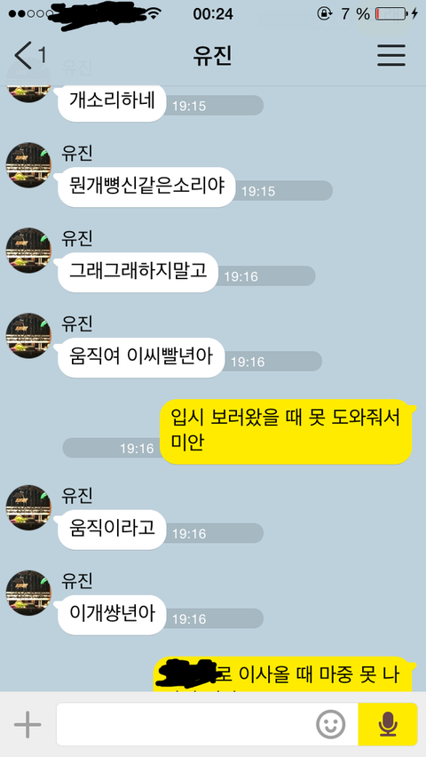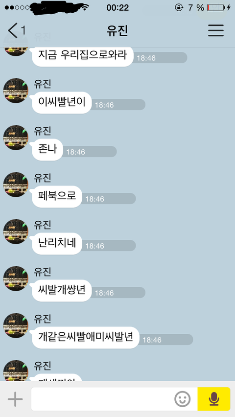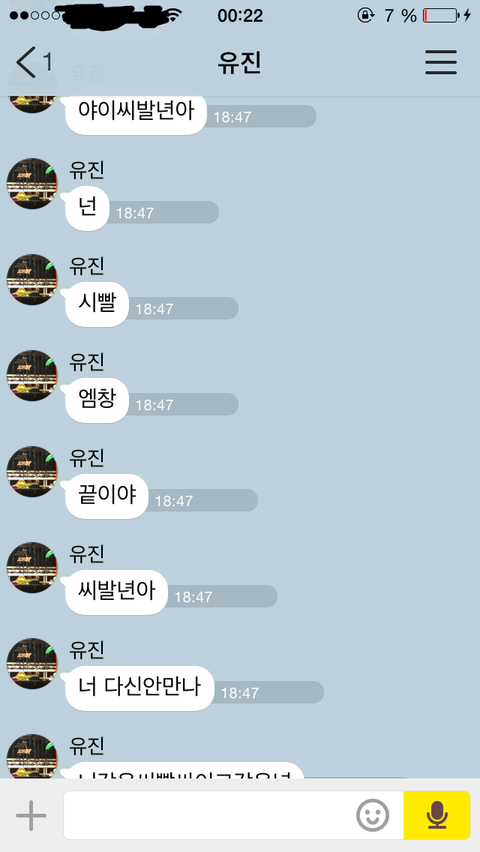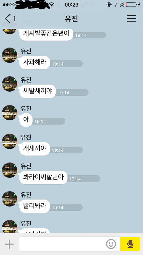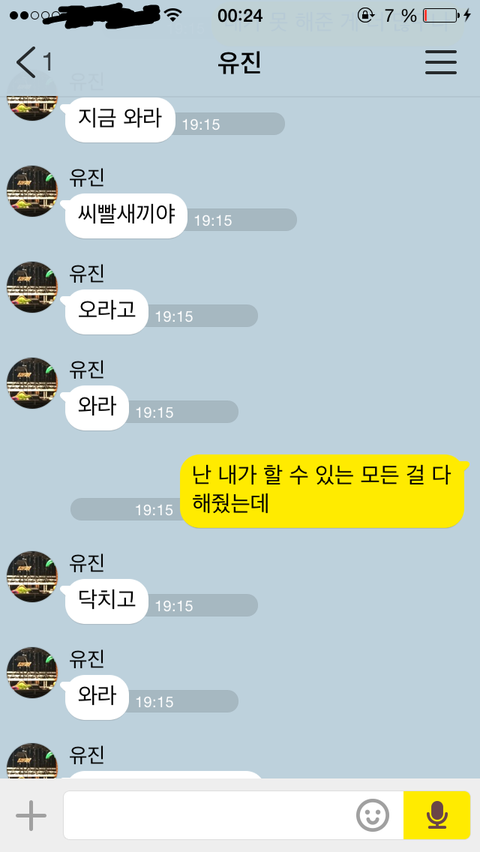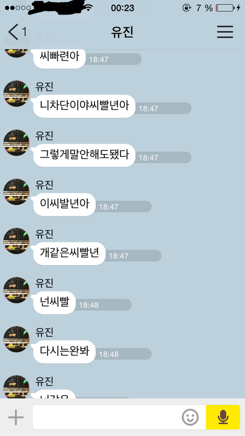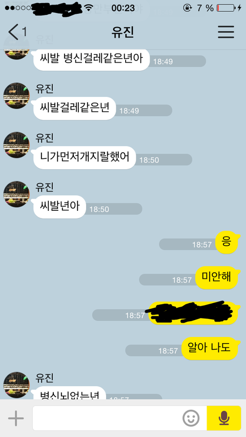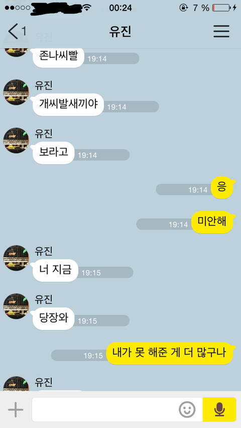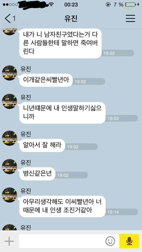 2014년 10월 25일, 전남친은 또 제 페이스북을 보았고, 사실여부와 상관없이 제가 어떤 오빠와 잤냐며 또 추궁을 했습니다. 우리엄마가 한국 가실 날이 얼마 남지 않아 일주일 정도 만나지 않고 있을 때였습니다. 그 때에만 해도 전남친이 점심 뭐 먹지, 만나서 밥만 같이 먹으면 안 되나, 등의 말을 할 때였습니다. 그래서 하루 나가서 전남친과 같이 밥을 먹기도 했습니다. 어쨌든 저 일로 인하여 제가 전남친에게 잘못(전남친이 카톡으로 저에게 욕을 너무 심하게 하길래 그 화면을 캡쳐해서 카톡 프사로 올림)을 저질렀고, 그래서 마음이 힘들어진 전남친은 본인 엄마에게 전화를 걸었습니다. 그리고 저는 전남친 엄마와도 통화를 했습니다. 저는 우리엄마로부터 전남친의 자존심을 지켜주려고 노력했었는데, 전남친은 본인 폰을 저에게 넘기며 이렇게 말하더군요. “얘기 좀 잘 해줘.” 나중에 이 얘기도 전남친에게 하니 전혀 기억 못 하더군요. 그래서 저는 어머님과 통화하는 내내 “잘못했습니다. 죄송합니다. 제가 혼자 좋아해서 혼자 따라다녔습니다.” 라고 말씀드렸습니다.