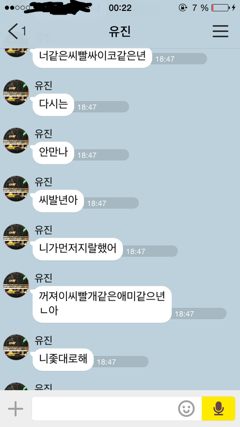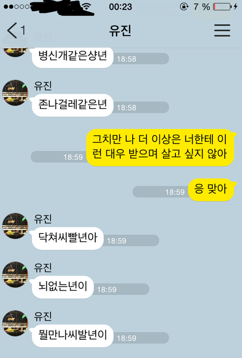 그는 처음부터 저에 대한 최소한의 예의조차 갖추지 않았어요. 그는 거의 매일 제 카톡과 페이스북을 통제했어요. 툭하면 저한테 “너 OO랑 잤지?” 저 이 말을 정말 수십 번 들었습니다.