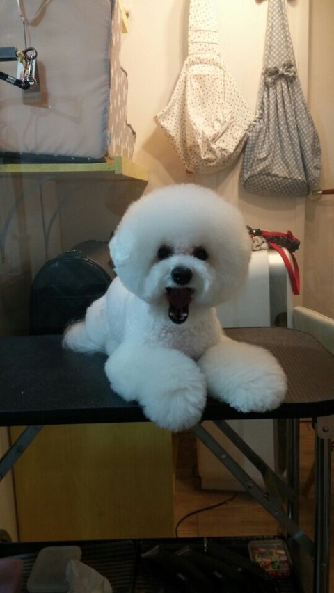 비숑프리제는 관리해주기나름이에요 저동그란얼굴이 포인트인데 미용한번할때 8~15만원 까지도해요. 빗질을 해줄수록 털이 풍성해져서 헬멧이 더살아나요