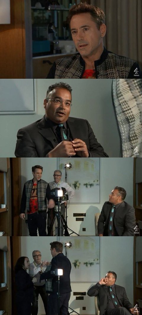 로버트 다우니 주니어는 영국 채널4 언론인 크리쉬난 구루 멀티와 인터뷰 도중 자신의 약물 중독 과거가 언급되자 인터뷰를 중단했다.