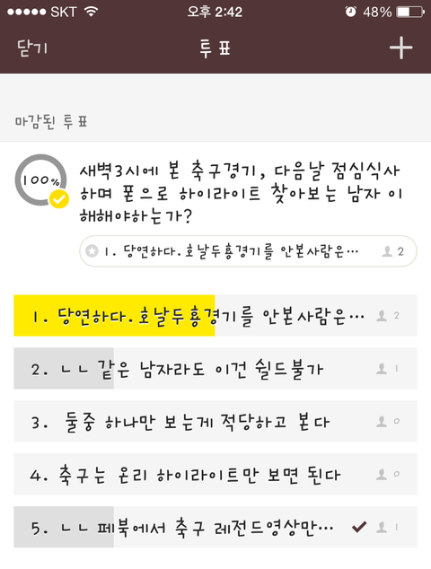 [투표]새벽 3시에 본 축구경기, 다음날 점심식사하며 폰으로 하이라이트 찾아보는 남자 이해해야하는가?