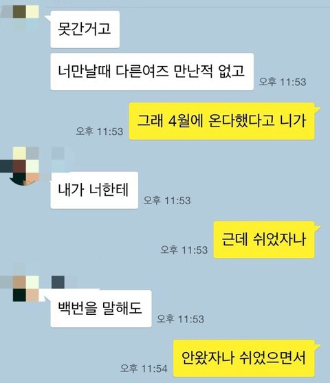 같이 못보내니까 1월말 2월초쯤 가서 같이 데이트하고 잠도자고 아버지 전화도 저랑 떨어져서하고 카톡에 나말곤 없던 모르는 여자들 즐겨찾기들 자기가 한적 없고 카톡 이상해서 다시 깔았는데 모른다고 우기더라구요 딱 잡아떼고 믿어야죠 내남잔데 그러다 카스 쪽지에 여자친구 없다는 답장에 속상해서 엉엉 울었어요 밉다고