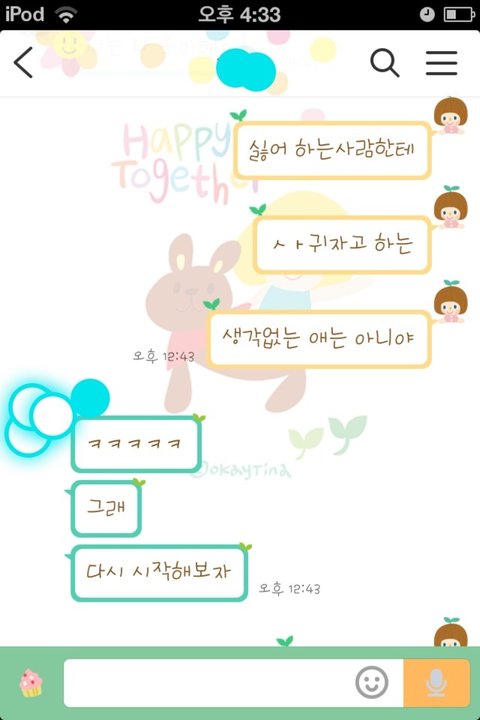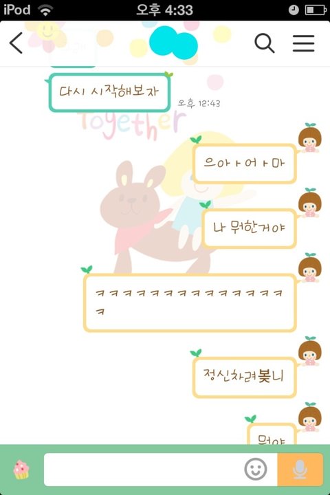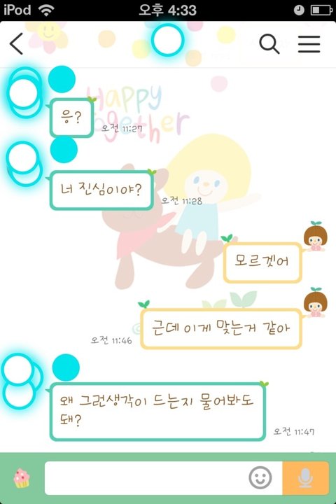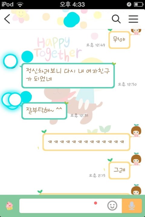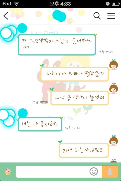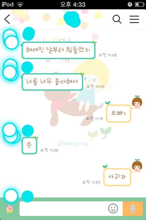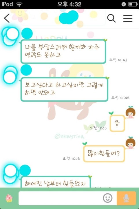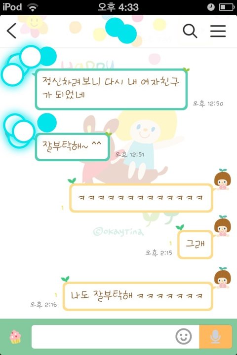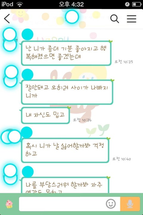 오빠가 저 카톡을 시작한건 어제 제친구 @가 생일이엇능데 고3이라 연락방법이 없엇던터라 오빠가 대신 생일축하 편지ㅣ쓰면 전해주겟다 해서 써서 보냇는데 혹시나 오빠가 못볼까바 전활햇어요 친규한테. 근데 안받는데서 장난삼아 제가 평소에 좀 잘하지 그랫어~ 이러다 막 옛날에 오빠가 저랑 좀 다투고 친구 아빠도 옆에잇엇능데 제친구 잡고 ㅋㅋㅋㅋ 이해가 안간다고 제가 왜 화가난거냐 막 묻고 그래서 친구가 많이 당황햇럿거든요. 오빠도 아직도 미안해해요 그건.. 그러다 저렇게 훅 들어오더라구요