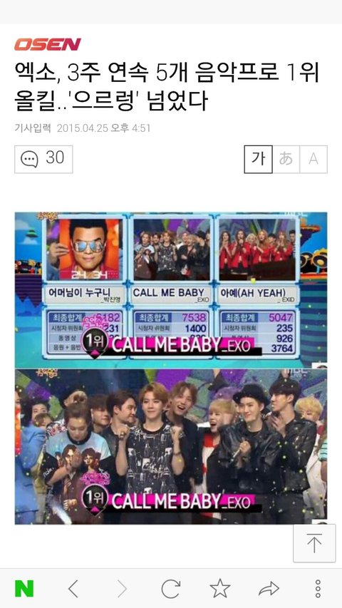 엑소 음악방송 3주연속 올킬