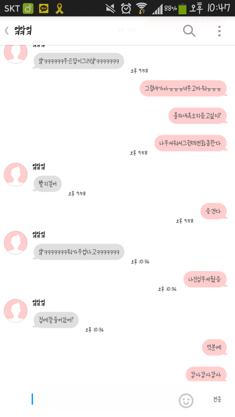 공부하다가집에가는길에얘랑톡하고있었는데뒤에누가따라오는거같은거야ㅜㅠㅜㅜ그래서전화좀한다고하닌깐20분정도통화해주고답이저렇게옴ㅠㅠㅠㅠㅠㅠ몰라김칫국일수도있는데너네가판단좀해줘ㅠㅠㅠㅜ우리는여고고쟤랑은중학교때부터친했던친구라서그냥친구인거지????