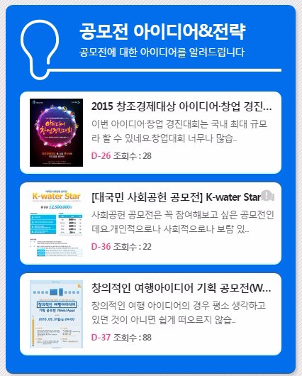일반적으로 공모전을 단순히 정보만 제공하는 것이 아니라 아이디어에 전략까지 제공하는 사이트입니다.