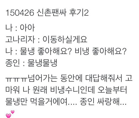 물냉이래 물냉!!!!!! 종인이는 물냉이었어 흡...종인아 나도 물냉 좋아해 앞으로도 평생 물냉만 먹을거야