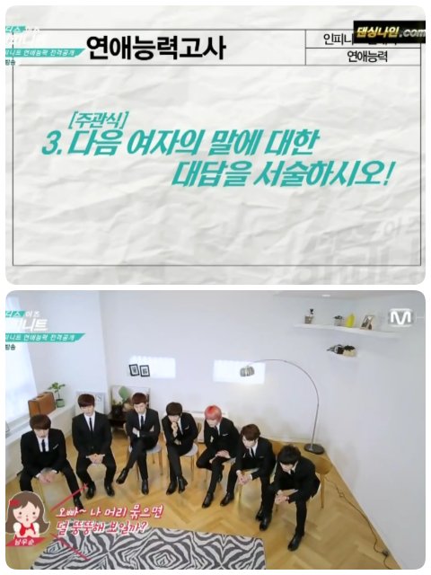 그 뒤에 중요한 말 왜 빠트려!!!!! 진지하게(작은눈을 마주치며) 머리가 중요한게 아니지라고 말한 김성규 이성종이 그건 아니지 라고 외치고 남우현은 뒤에서 꽃받침을 하며 이게(얼굴) 중요하다는 듯한 무언의 메시지를 날리고 있었음.