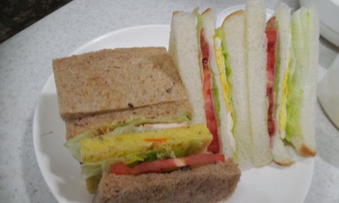- 우와~~ 저도 드디어 샌드위치를 이쁘게 만들었습니다. 닭가슴살을 이용한 샌드위치와 매콤한 맛을 좋아하는 저는 기본에 충실한 베이컨에 매운 소스를 엄청나게 뿌려 만들었습니다.