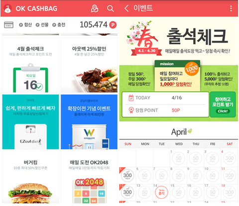 오케이캐쉬백 출석체크 이벤트는 평일엔 50포인트,