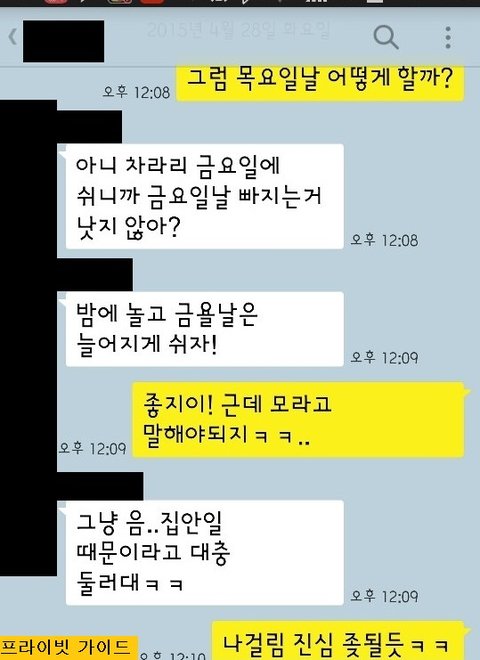 ? : 아니 차라리 목요일날 쉬니까 금요일날 빼는게낫지 않아? 밤에 놀고 금욜날은 늘어지게 쉬자!