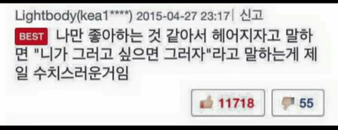 이제 한달 지남 한번도 안잡아준 그사람이 너무나 미웠음 하지만 나는 나를 사랑하지 않는 사람을 놓친거지만 그사람은 자기자신을 사랑해..