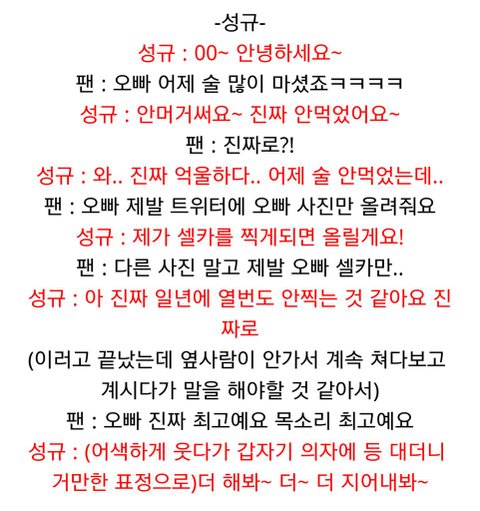첨에 공부도 쫌했다하고 학교에서 바른학생이었다니까 점점 그런이미지로 굳히더니 좀 오버하는거같고 그렇다보니까 점점 오바해서 도를 넘는거같음 예전에 라스나와서 사생들이 어짜고저쩌고 하니까 사생한테 좀 관대한 SM소속 규현이(SM은 약간 사생도팬이다 이런 의식을 가지고 있는듯함) 일부로 사생.팬 이라고 대놓고 찝어주는데도 사생들이 어쩌고 욕하는것도 선비이미지 만들려고 난리치는거같고 정작 인피니트는 사생도 몇 없으면서..