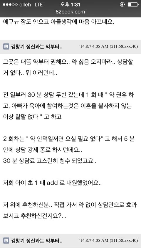 거기에, 알고보니 보험기록에 거의 중증환자처럼 끔찍한 병명을 붙여놓았습니다. 세상에 누구나 세상살면서 한번쯤 위로받고 싶은 마음이 김창기씨의 병원에서, 치욕스런 병명들로 보험에 기록될 줄은 몰랐습니다. 더욱이 화가 나는것은, 우리가 병원에 가면 감기면 감기라는 병명을 진단 받고 알게 된 후 약을 받든지 치료를 받습니다. 그런데 저는 '그러셨습니까, 힘드셨겠네요. 다음에 또 오셔서 상담받으세요.' 가 다입니다. 그리곤 약을 강제로 처방합니다. 약을 처방하는 이유도 일방적입니다. 먹고 싶지 않다고 해도 처방합니다.