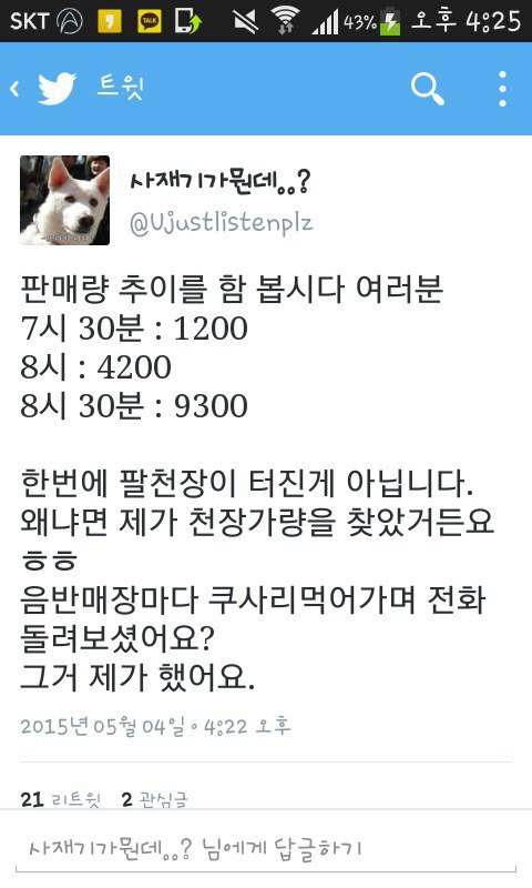 그리고 다시한번 말씀드립니다. 한터차트는 사람이 직접 입력하는것이라 그때그때 입력되는게아닙니다.몇일동안 팔린걸 그 한시간동안 입력했을가능성이 크다는거죠.그럼 한시간동안 급증한걸 설명할수있는거 아닌가요?