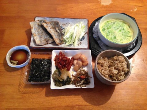삼치구이와 계란찜 밑반찬은 초석잠짱아치 , 마늘짱아치, 김치, 멸치 볶음 이에요!