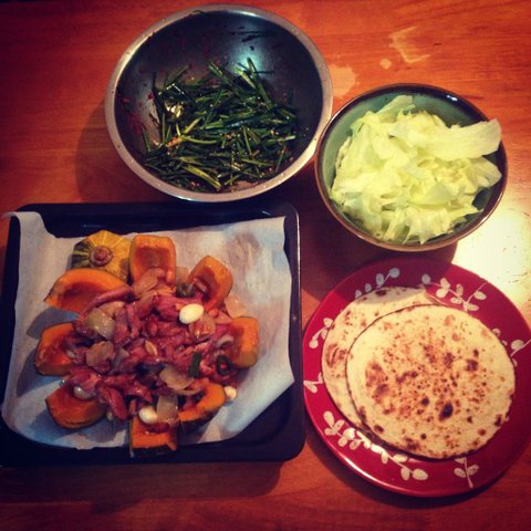부모님이 보내주신 무공해 단호박으로!! 오리훈제랑 야채볶아서 오븐에 돌렸어요!!