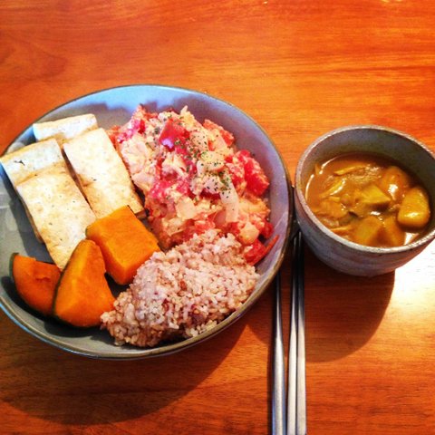 건강식!!! 토마토랑 계란스크램블 에그에 호박찐거랑 두부도 부치고! 카레랑 함꼐 샤샥~