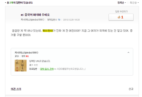2013년도 12월 말에 지식인에서 어떤 사람이 중국어글올려놓고 해석해달라했더라