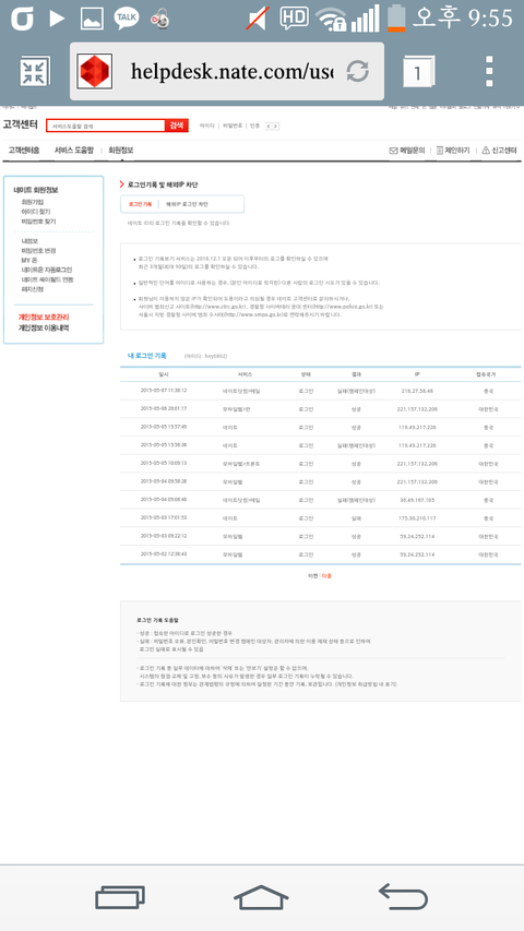 로그인해서 내정보 들어가고 로그인기록확인해봐 중국 베네치아 칠레 이런데에서 해킹하려고했는데 나는 중국에서 해킹하려고했는데 실패야..ㅜㅜ후 어떤글에서 봐가지고 아닐줄알아서 들어갔더니 대한민국밖에 없어서 휴 다행이다하구 다음페이지로 갔는데 중국에서 해킹하려다 실패했네 너네도 혹시 모르니까 확인해!