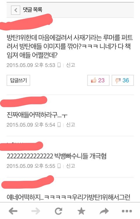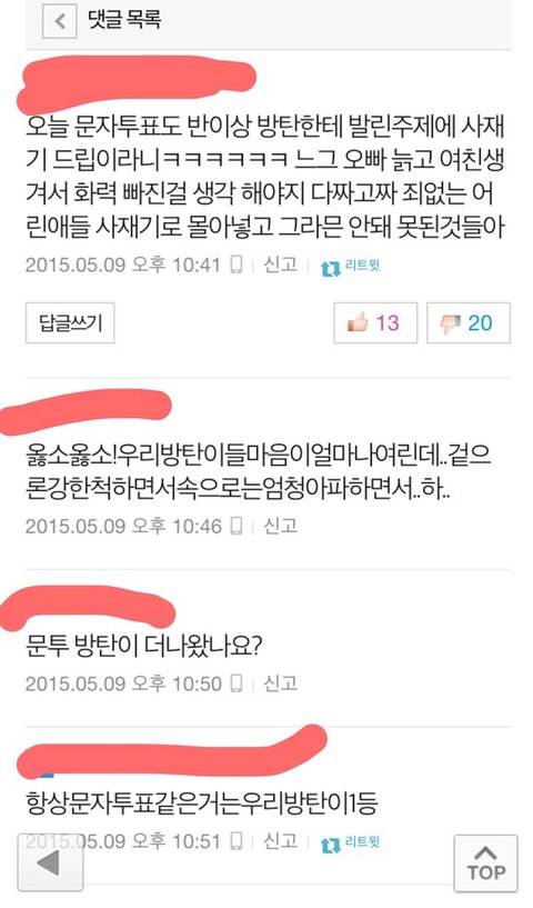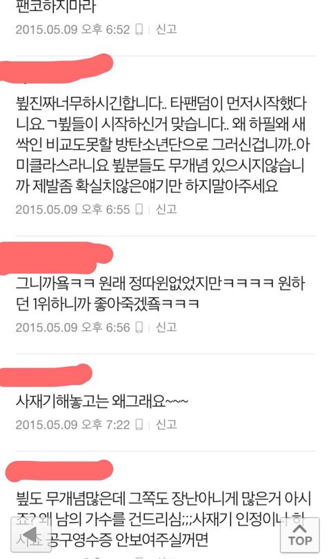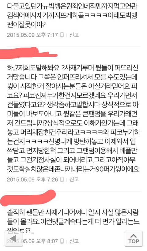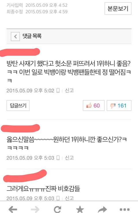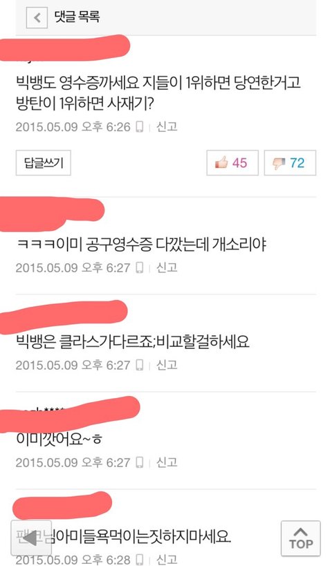 일단 나는 뷮인데 빅뱅 흔들어때부터 골수팬이라고해야하나 하여튼 솔직히 좀 빅뱅이 활동도없어서 그냥 이제 연예인안좋아하고 걍 그랬는데 빅뱅이컴백해서 오늘 빅뱅 일위기사 본다음 댓글보고 이상황을알았는데 내가 쳐보니깐 빅뱅도 사재기했다고하던데 네이버에 치니깐 엄청 쉽게 영수증 인증도 나와있고 아직 방탄팬분들은 인증안한걸로 알고있어 그리고 좀 댓글보면서 좀심하다고생각해서 캡쳐해온건데 물론 이렇게 뷮한테 좋은쪽으로만 댓글을 가져온것같기도 하지만 보면서 좀 눈살찌푸려지는것들만 가져왔어 그리고 방탄사재기 논란도 뷮이 먼저 퍼트렸다는데 그건진짜 뭔 개소리인지도모르겠고 뷮이 먼저했다는 증거가있으면 믿겠지만 아직 그 증거를 내가 못봤기때문에 일단 이렇게 글쓸게 그리고 내가 판에 글처음쓰고 판할 나이도 아니지만 그냥 답답해서 써봐 말이 좀 앞뒤가안맞아도 그냥 읽어줘 미안..
