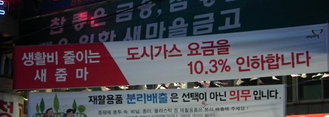 시장 어귀에 걸린 "도시가스 요금을 10.3% 인하합니다"라는 플래카드 밑, 과일 가게에서 과일을 사던 아주머니의 말에 주인은 연신 고개를 끄덕거린다. 이쯤 되고 보면 도시가스 요금 인하를 박근혜 행정부나 여당의 치적으로 둔갑시킨 새누리당 홍보 전략을 나무라야 할지, 플래카드 내용 하나로 박근혜 대통령과 여당, 야당을 각각 지지와 규탄의 대상으로 나누는 아주머니의 정치 안목을 탓해야 할지 아리송하기조차 하다.