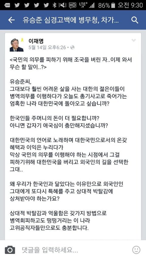 사내새끼가 군대가겠다고 했다가 잠적하고 해외 도피했으면 조용히 거서 조용히 살아야지. 떳떳하게 모국이 그립다 가고싶다.그러면서 감정에 어필하는 거는 아니지. 헌법 국민의 권리가 있고 의무가 있는데 대한민국 헌정질서를 거부했으면 그 책임을 감수해야지.