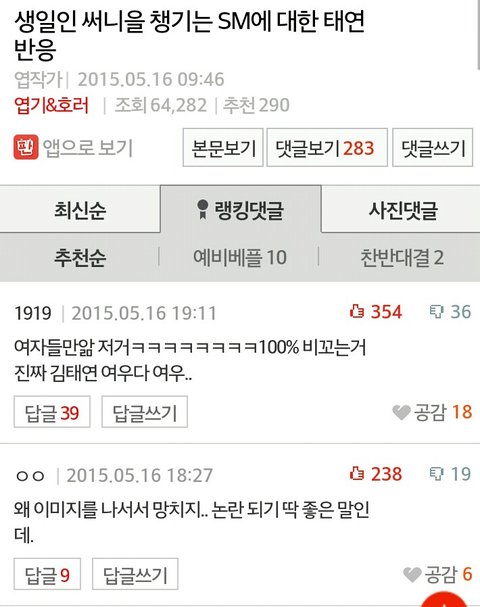 저건 디스한것도 아니야 지금까지 저글 올라온 타싸이트 반응 다 태연/써니 귀엽다 태연 센스있다 이런 반응이었는데 여기만 이지랄인거지... 진심 저게 왜 저렇게까지 까여야만 하는건지....