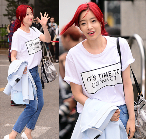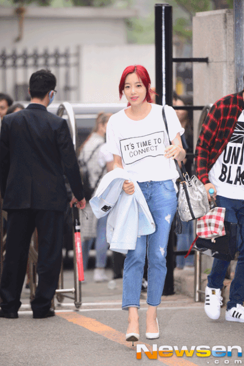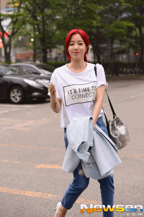 뮤직뱅크 출근길에 빨간머리를 하고 나타난 은정을 포착할 수 있었음!