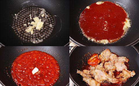 허니버터 고추장 닭강정 소스: 버터1 2큰 술, 다진 마늘 1 큰 술, 케찹 3 큰 술, 고추장 2큰 술, 간장 1/2큰 술, 맛술 1큰 술, 딸기쨈 2큰 술, 꿀 5큰 술, 버터2 1작은 술