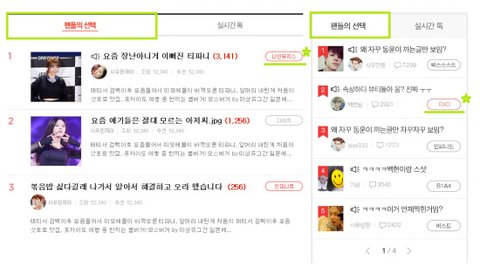 * 홈 화면 > 팬들의 선택 메뉴 탭에서 1위부터 20위까지 선정된 게시글들을 확인해볼 수 있어요.