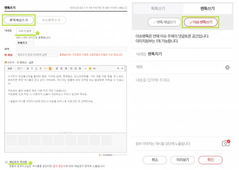 * 팬톡채널쓰기는 기존 에디터 방식과 동일하며 이슈팬톡쓰기는 별도의 채널 지정 없이 제목+내용만으로 글쓰기가 가능해요. 단, 이미지 첨부는 1장만 가능합니다.