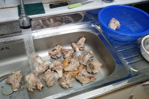 씽크대와 걸음망 깨끗히 씻고 흐르는물에 새수새미로 돼지사골 닦고 있는중이랍니다.