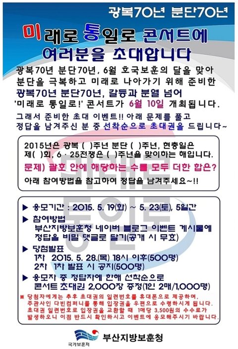- 초대권 응모 - 부산지방보훈청 블로그에 댓글 달기(정답은 265) http://durl.kr/8ujz77