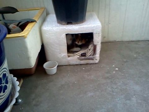 (화분에 들어가 웅쿠리고 자는 모습이 너무 애처로워 처음으로 길고양이 람쥐에게 바람막이용 집을 만들어 준 모습입니다.)