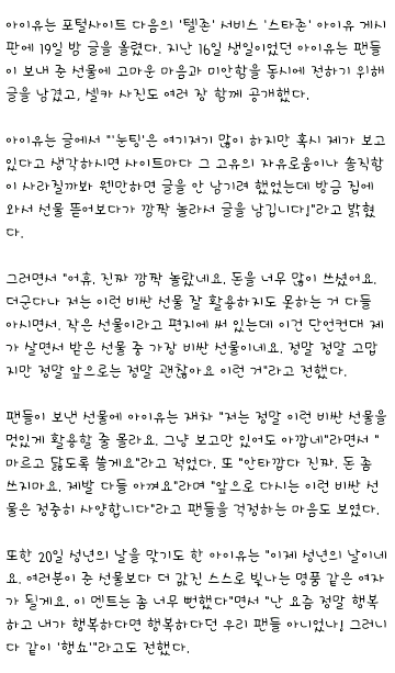 옛날부터 팬사랑 쩔기로 유명한 아이유. 팬사랑 관련된 일화가 너무 많지만 간단하게 몇 개만 소개해봄