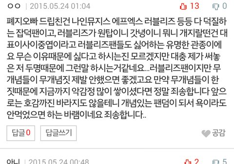 어제오늘보니깐 판에 럽리즈 언급 많이되던데 한동안조용했던걸 갑자기어제 러블리즈글이폭풍으로올라오고 또내용에는 러블리즈욕먹이게하는글 팬코인거같은데 왜그러는지 정말노이해네요ㅠㅠ 어제 저도비원에이포응원하러 드콘갔는데 러블리즈나올때 응원소리크고 러블리즈팬들분도 성규앨범나와서 스밍인증도많이해주고그러던데 왜타퀴가나서서 또이간질중인지 모르겠네요..ㅎㅎ 어제판돌아다니다가 댓글을봤는데 저말이 맞는듯하네요 어느팬덤에나 무개념있듯이 그냥 무시랑병머금이 최상의방법이라고생각해요 그리고 성규1위축하합니다